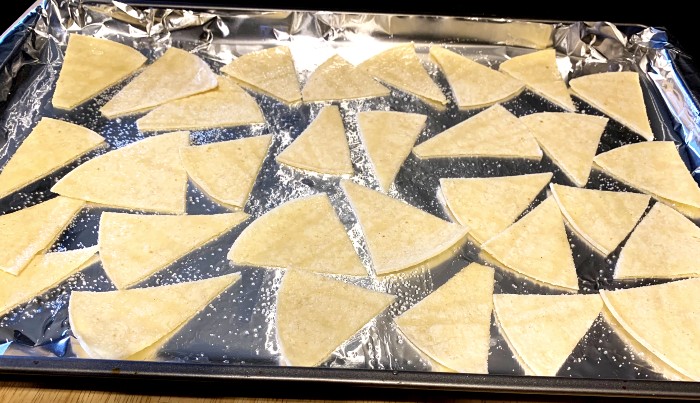 - Spread the cut tortilla triangles out on the baking sheets in a single layer and season with salt or seasonings.